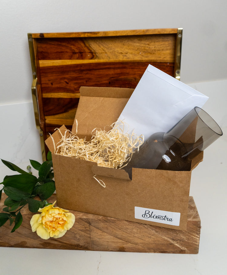 Gjafaaskjan er heimsend til kaupanda. Í gjafaöskjunni er blómavasi sem hentar vel fyrir Blómstru blómvendi ásamt gjafabréfi með kveðju sem þú getur sérsniðið og þeim fjölda blómvanda sem þú vilt.