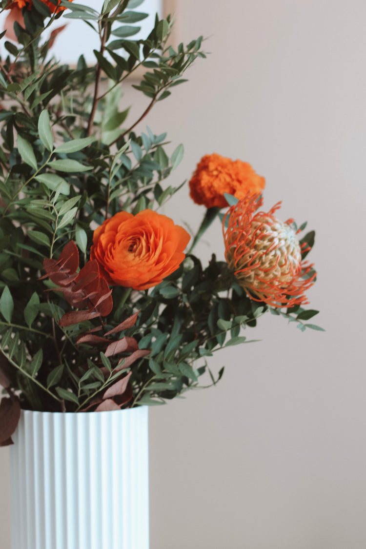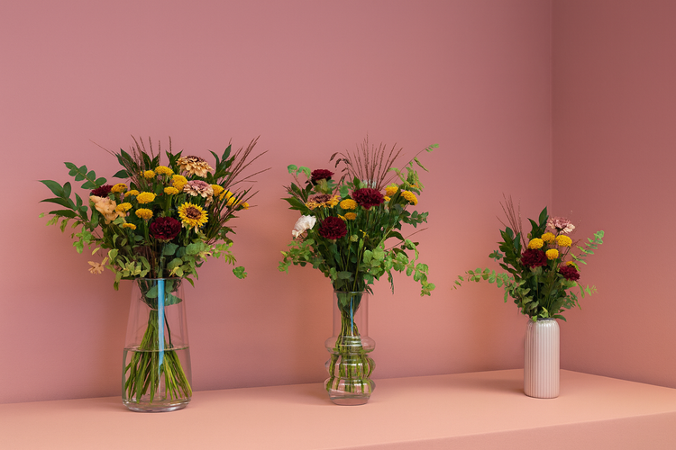 Við bjóðum upp á þrjár stærðir af Blómstruvöndum. Hér að neðan sérðu mun á stærðum. Stíll vandarins á myndinni er poppaður og hannaður að hausti til.